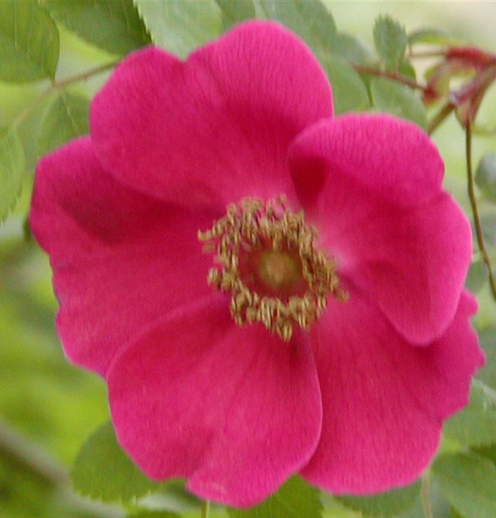2.5 m; geraniumrot, orangerote Hagebutten; einmalblühend Wildrose chinesischer Herkunft