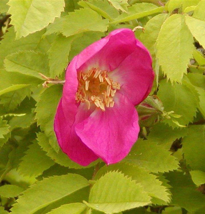 1.2 m; einheimisch; einmalblühend; purpurrosa, leicht duftend, Hagebutten