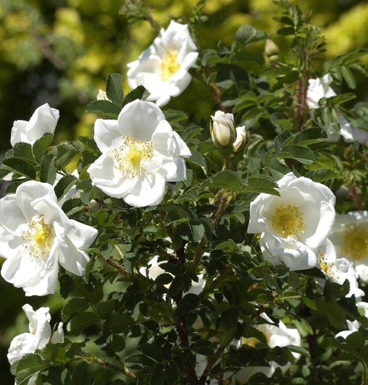 1.5 m; einheimisch; weiss - hellgelb; leichter Duft; einmalblühend, kugelige, schwarze Hagebutten