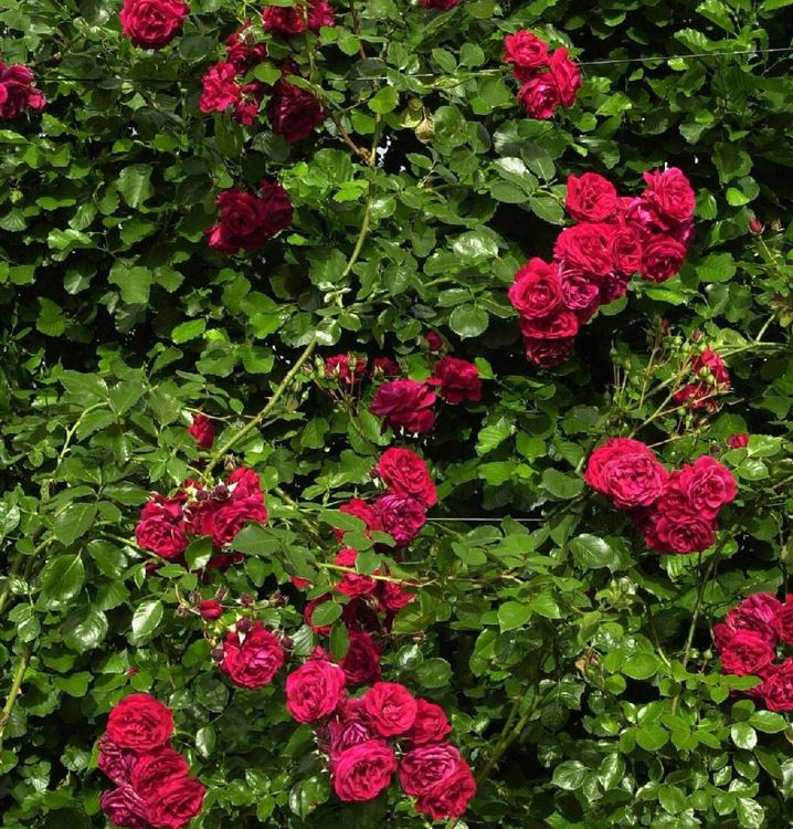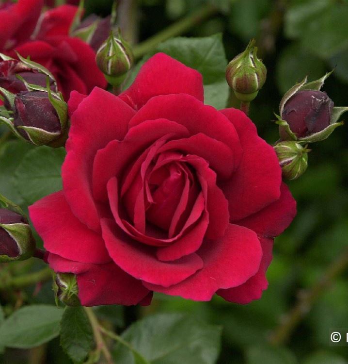 Als blühende Fassadenbegrünung ist die Kletterrose 'Sympathie'® (Rosa 'Sympathie'®) einfach ein wunderbarer Anblick. Vor allem sind es ihre schalenförmigen, gefüllten, samtroten Blüten, die diese Wirkung erzeugen. Sie trägt sie von Juni bis Oktober und lässt sie einen starken Duft verströmen.