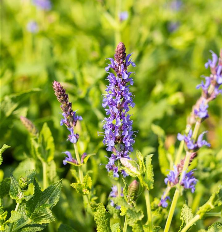 Der Garten-Blüten-Salbei 'Blauhügel' (Salvia nemorosa 'Blauhügel') ist zum Beispiel eine hervorragende Steingartenpflanze, genauso wie er in Blumenkübeln eine gute Figur macht. Mit seinen lippenförmigen Blüten in Blau ist der Garten-Blüten-Salbei 'Blauhügel' von Juni bis September ein Blickfang. Doch er ist nicht nur eine Augenweide, denn die Blüten verbreitet auch noch einen angenehmen Duft und werden gerne von Bienen und anderen Insekten angeflogen. Seine lanzettlichen Blätter tragen ebenso zu seiner Wirkung bei. Sie sind mittelgrün gefärbten.
