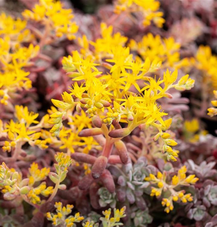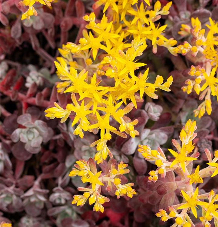 Das Spatelblättrige Garten-Fettblatt 'Purpureum' (Sedum spathulifolium 'Purpureum') ist zum Beispiel eine hervorragende Steingartenpflanze und auch ein prima Bodendecker. Mit seinen Blüten in Gelb ist das Spatelblättrige Garten-Fettblatt 'Purpureum' von Mai bis Juni ein Blickfang. Seine dickfleischigen Blätter tragen ebenso zu seiner Wirkung bei. Sie sind dunkelrot gefärbten.