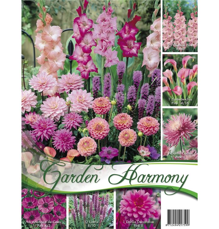 1 Kaktus-Dahlie rosa; 1 Schmuck Dahlie rosa; 20 Gladiolen rosa 8 / 10, 15 Anemonen rosa 4 / 5; 12 Liatris 8 / 10; 1 Zantedeschia rosa 14 / 16