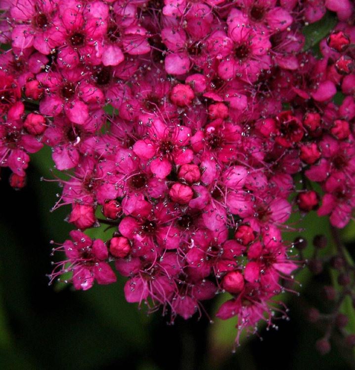 Die Blütezeit beginnt für die Sommerspiere 'Anthony Waterer' ab Juli. Dann trägt sie Trugdolden mit 15 cm bis 20 cm grossen, magentafarbenen Blüten. Bis September hält die Blüte an.