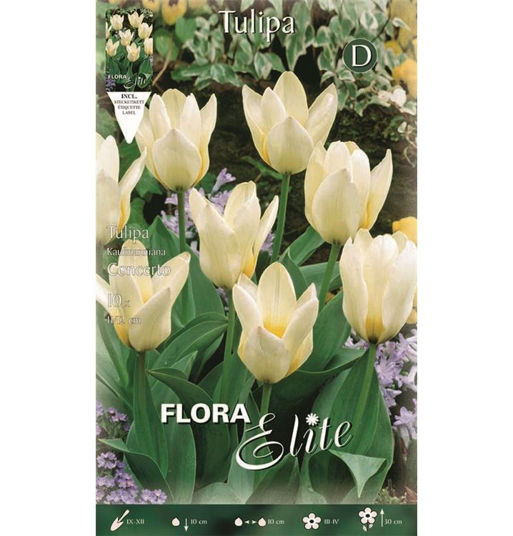 Die Blütezeit beginnt für die Tulpe 'Concerto' ab März. Dann trägt sie 6 cm bis 8 cm große, cremeweiße Blüten. Noch dazu verströmen sie einen angenehmen Duft. Bis April hält die Blüte an.
