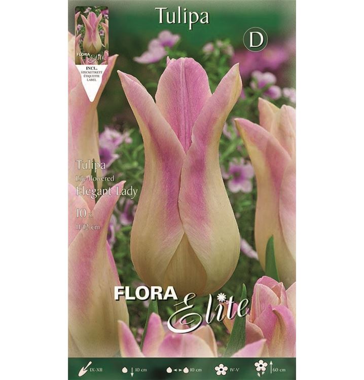 Die Blütezeit beginnt für die Lilienblütige Tulpe 'Elegant Lady' ab April. Dann trägt sie zweifarbige Blüten. Noch dazu verströmen sie einen angenehmen Duft. Bis Mai hält die Blüte an.