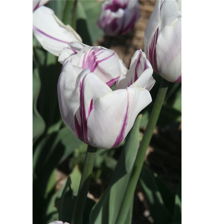 In schön bepflanzten Rabatten, aber auch in Kübeln auf der Terrasse oder in Kästen auf dem Balkon ist die Tulpe 'Flaming Flag' (Tulipa 'Flaming Flag') immer wieder gern gesehen. Mit ihren Blüten in Lila-weiss trägt die Tulpe 'Flaming Flag' von April bis Mai auf ihre Weise zur Gestaltung bei. Dabei ist sie nicht nur eine Augenweide, denn sie verbreitet auch noch einen angenehmen Duft. Als Grundlage dienen dabei ihre linealen Blätter in Dunkelgrün.