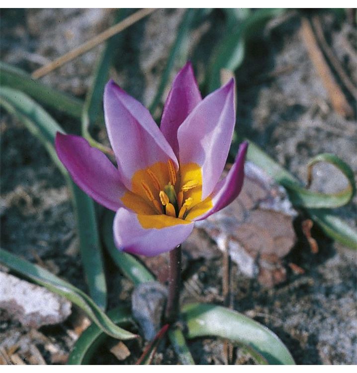 Die Blütezeit beginnt für die Niedrigen Tulpe ab April. Dann trägt sie purpurrote Blüten.