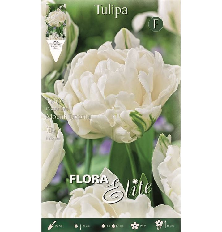 In schön bepflanzten Rabatten, aber auch in Kübeln auf der Terrasse oder in Kästen auf dem Balkon ist die Tulpe 'Mount Tacoma' (Tulipa 'Mount Tacoma') immer wieder gern gesehen. Mit ihren gefüllten Blüten in Weiss trägt die Tulpe 'Mount Tacoma' von April bis Mai auf ihre Weise zur Gestaltung bei. Als Grundlage dienen dabei ihre linealen Blätter in Dunkelgrün.
