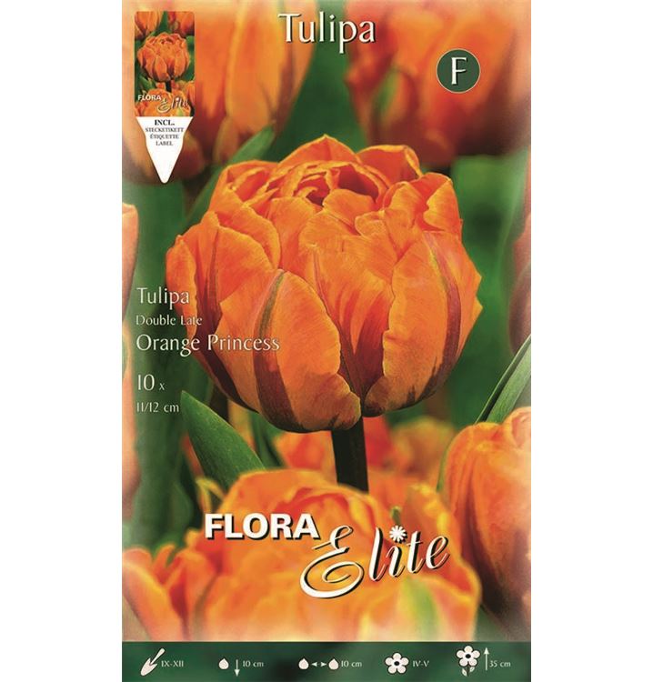 Die Blütezeit beginnt für die Tulpe 'Orange Princess' ab April. Dann trägt sie 6 cm bis 8 cm grosse, orangefarbene Blüten. Noch dazu sind sie gefüllt und verströmen einen angenehmen Duft. Bis Mai hält die Blüte an.