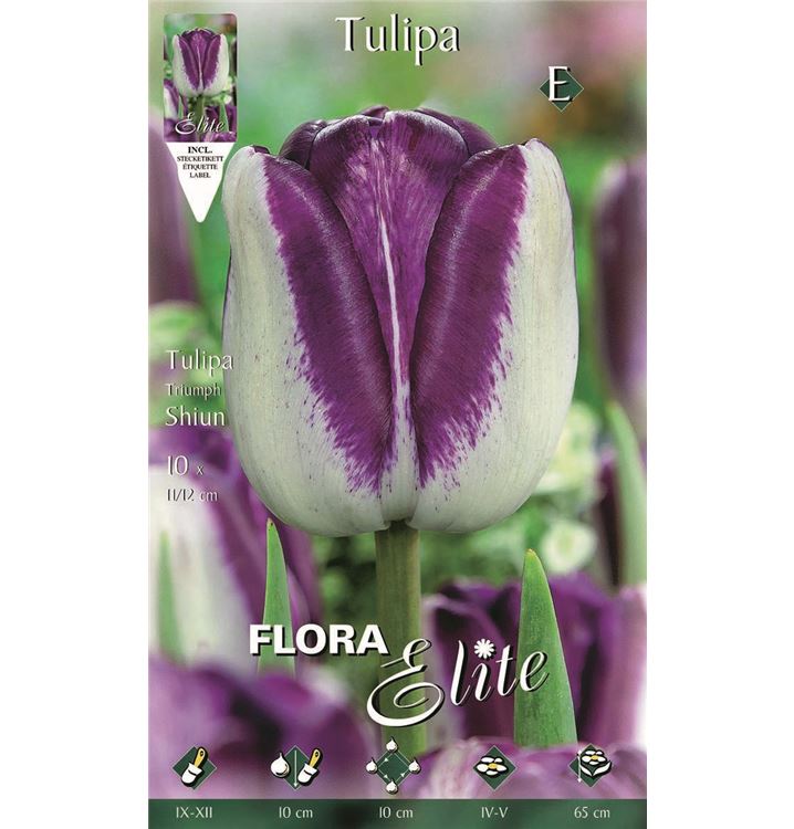 Die Blütezeit beginnt für die Tulpe 'Shiun' ab April. Dann trägt sie 6 cm bis 8 cm grosse, lila-weisse Blüten. Noch dazu verströmen sie einen angenehmen Duft. Bis Mai hält die Blüte an.