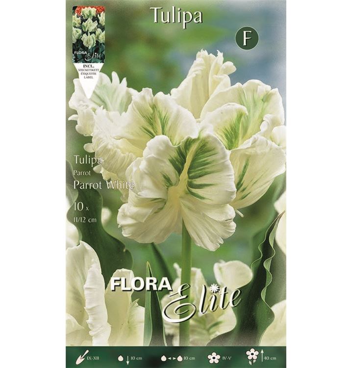 Die Blütezeit beginnt für die Papageien-Tulpe 'White Parrot' ab April. Dann trägt sie 6 cm bis 8 cm grosse, gewellte, weisse Blüten. Noch dazu verströmen sie einen angenehmen Duft. Bis Mai hält die Blüte an.