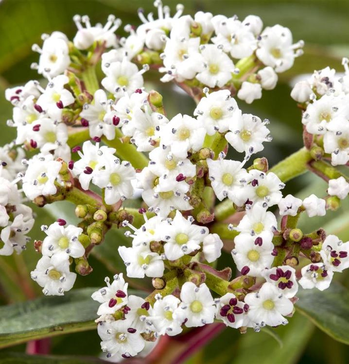 Die Blütezeit beginnt für den Immergrünen Kissenschneeball ab Juni. Dann trägt er Trugdolden mit, hellrosafarbenen Blüten. Noch dazu verströmen sie einen starken Duft.